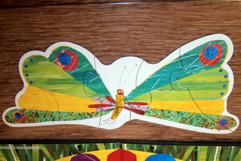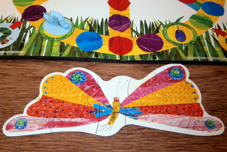 Игра для 2-4 игроков, возраст от 3 лет. Состоит из игрового поля, 4 гусениц-фишек, 20 частей пазла, 58 карточек хода. Цель игры быстрее всех собрать свою бабочку.