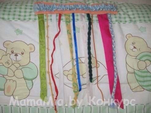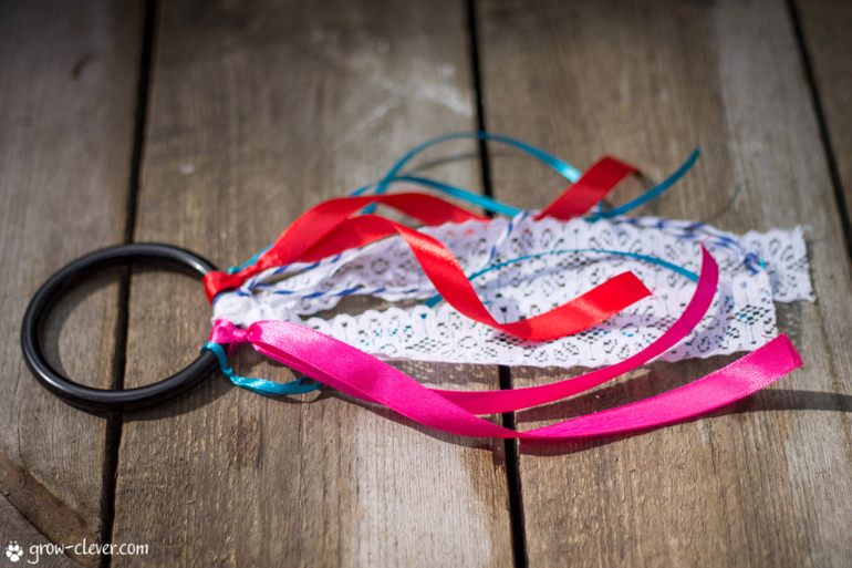 Эта яркая махалка не простой предмет. Она учит малыша следить за быстро движущимся предметом. Волнистые цветные ленточки приковывают взгляд масиков. Дайте такое колечко в руки малышу и он будет радостно наблюдать за движением лент. Для такой забавы пригодится пластиковое или деревянное кольцо, ленты и кружево длиной около 40 см. Каждую ленточку нужно крепко и надёжно завязать на двойной узел.![]()