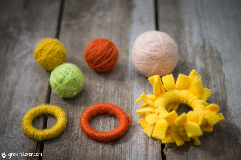 25.Шарики и бублики - вечная любовь малышей. Их можно катать по полу, грызть, кидать, мять в ручках, заталкивать в разные места и так далее. Эти маленькие предметы особенно заинтересуют малыша, который учится ползать и карапуза, сидящего в слинге. Чтобы сделать шерстяной клубочек безопасным для детей, его можно постирать в горячей воде с мылом. От этого он сваляется и уже наверняка ни одна ниточка не будет отходить от клубка и попадать в маленький ротик.