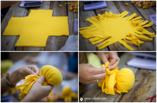 А жёлтый мохнатый бублик легко сделать из деревянного кольца от карниза и флисовых ленточек. Каждую ленточку просто нужно завязать в двойной узелок на кольце.
