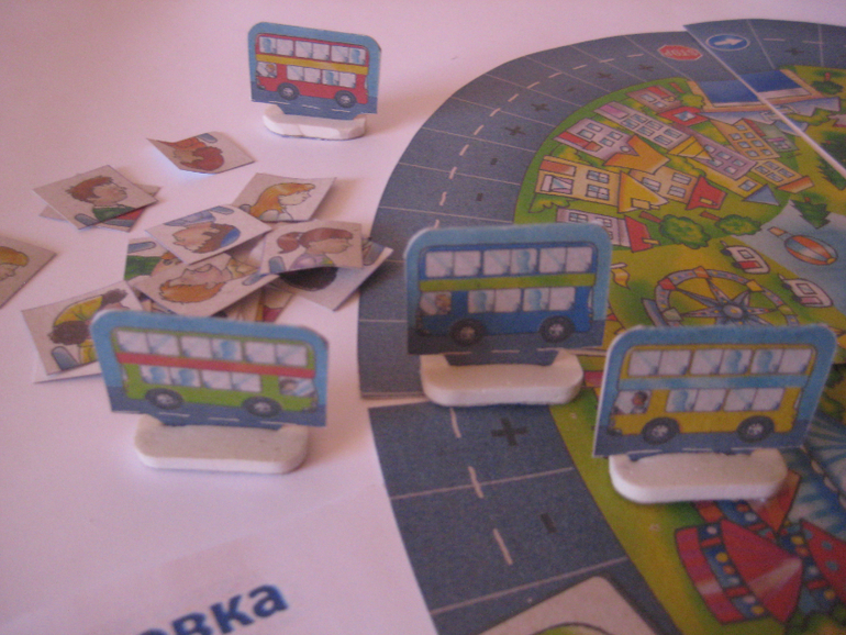 Еще одна игра Orchard Toys "Bus Stop" (Автобусная остановка). Веселая игра, красивые рисунки, параллельно учим сложение и вычитание. Все распечатано на листах картона, фишки автобусов - двусторонняя картинка на листе картона, вставлена в подставку.