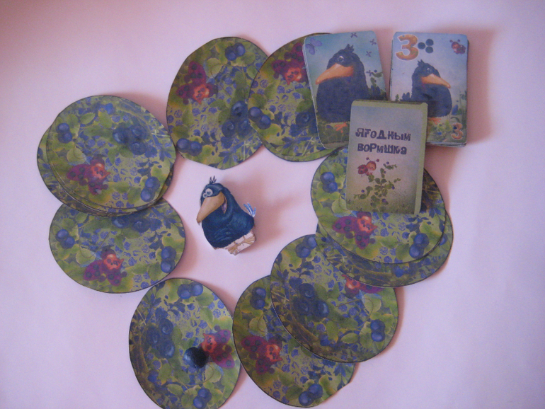 А это в свое время самая любимая игра старшего сына (спустя год как-то отошла) - Ягодный воришка. Поля черники, карточки действия да и сам ворон распечатаны на листах картона, вместо ягод черники - пластилиновые шарики.
