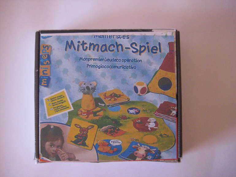 Это моя первая игра. "Mitmach Spiel" (Мышка строит домик) Ravensburger. Игровое поле и карточки распечатаны на фотобумаге, вместо мышки у нас серый слон (вот думаю, может ему хобот чуть ушить), домик кроила и шила из пеленки, крепятся детали между собой липучками.