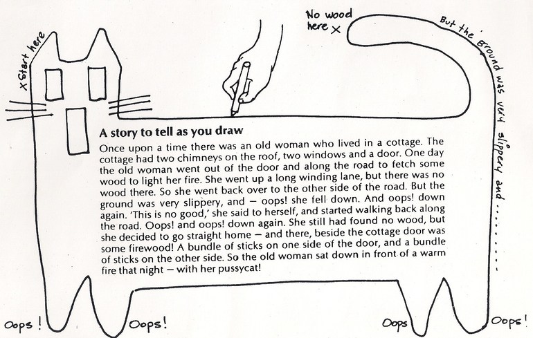 Если вы куда-то едете или ждете в очереди, в общем, нужно чем-то занять ребенка, подобные истории очень выручают. Их смысл в том, что вы рисуете и одновременно рассказываете сказку. Когда рисунок закончен, получается изображение, которое изначально не ожидалось. В общем, проще показать, чем объяснять))) В этом посте я собрала несколько штук.
