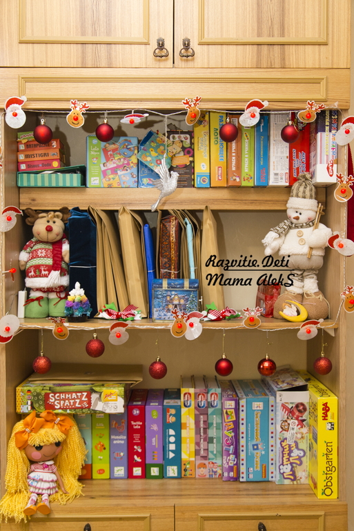 задания адвент в этом году на полке, а не под елкой (Ярослава бы все конверты открыла за 5 минут )))) ).