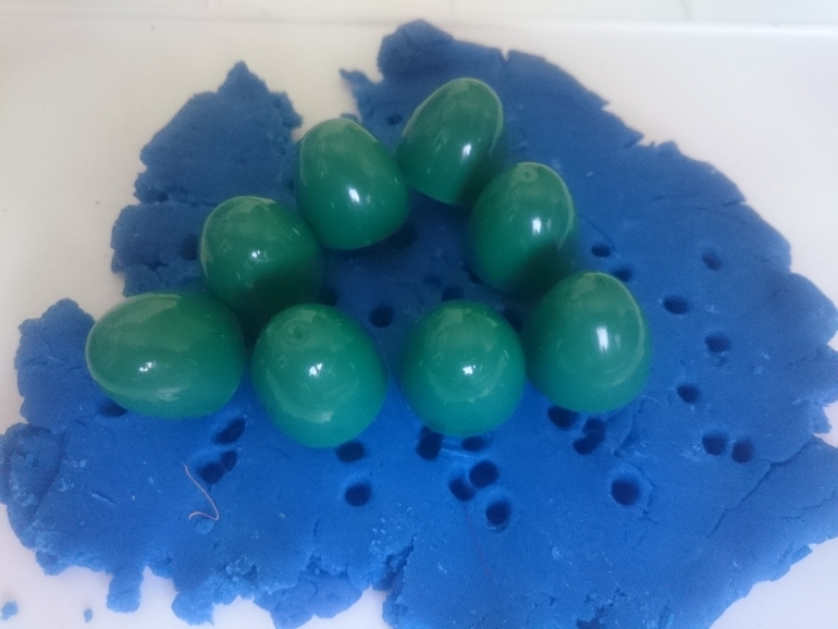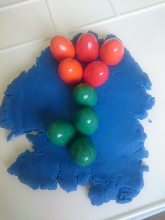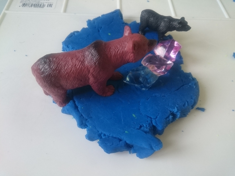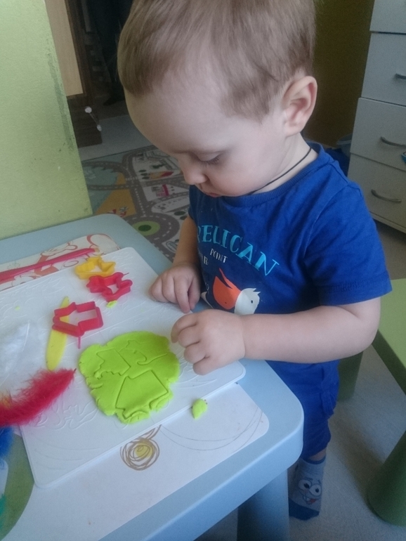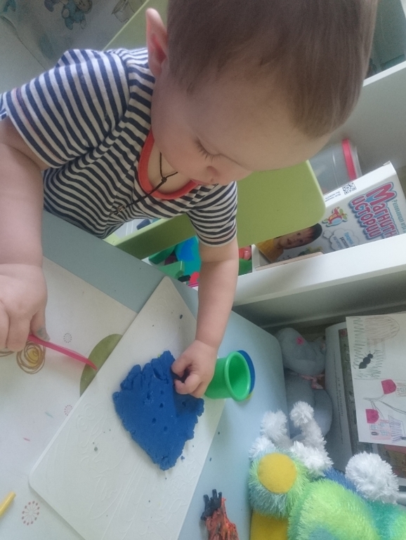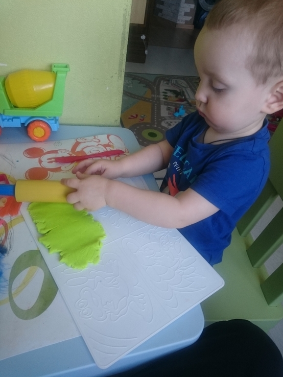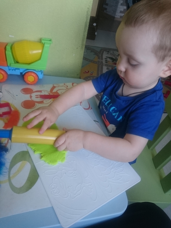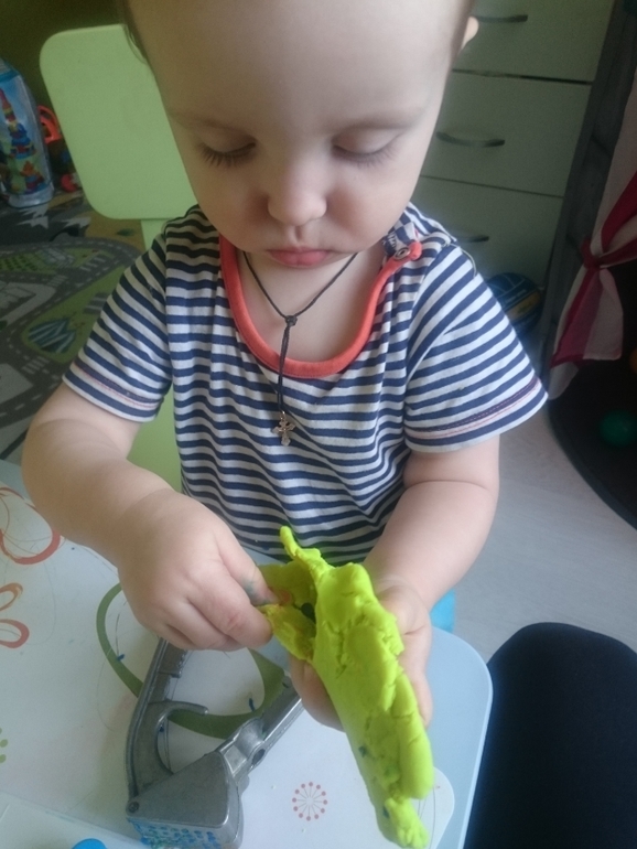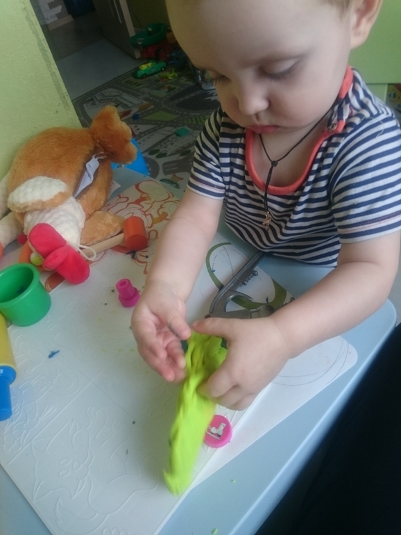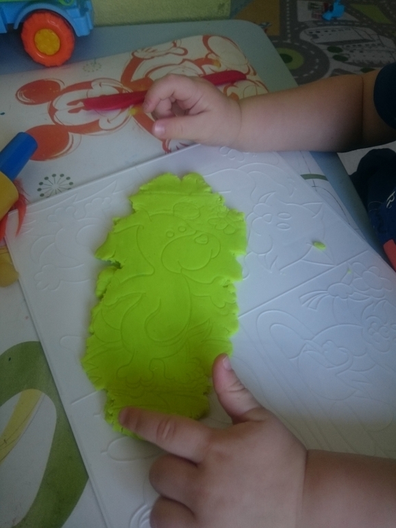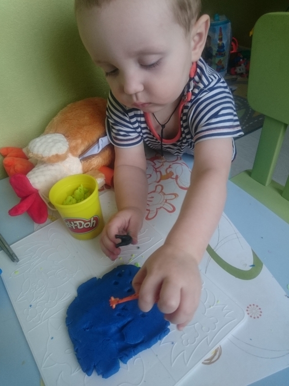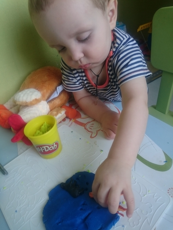 А это Олежка справляется с моим самодельным вареником из пластилина. В него спрятан сюрприз, любимая фигурка мишки. Классное задание, малышам очень нравится искать предметы и мелкая моторика развивается)))