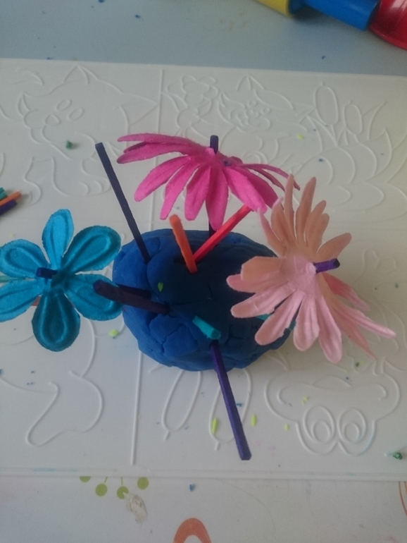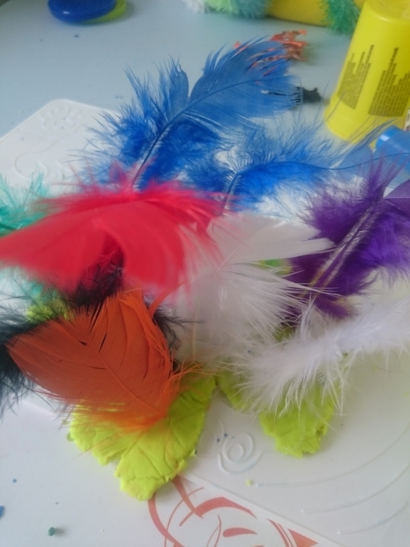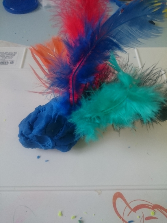 А это наши эксперименты с перьями. Тоже делаем разные вариации, в основном птичек разных петуха, павлина, шляпу с перьями, вазу и просто втыкаем в пластилин. Перья можно купить там же, где я прилагала ссылку на все для творчества.