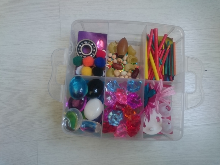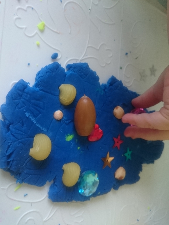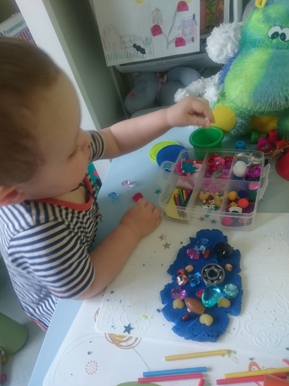 Это то, что подходит малышам с самого начала знакомства с пластилином и тестом. Вминание абсолютно разных предметов в тесто. Это могут быть макароны, косточки, горох, орешки, камушки, стразы, глазки и прочее. Вот тут есть разный творческий ассортимент на выбор. У нас коробочка и в ней все разложено, я даю ее Олежке под своим наблюдением и он берет оттуда все, что хочет и все вминает в пластилин. В итоге получается ковер))