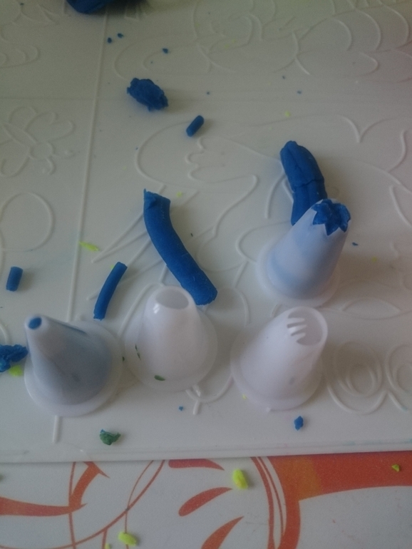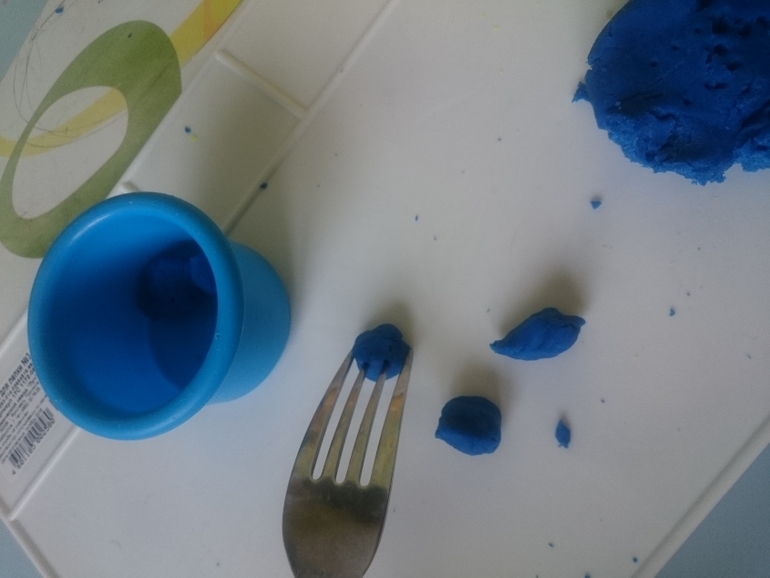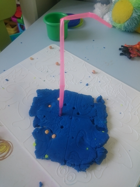 А это мы с помощью коктейльной трубочки давим на пластилин и он туда собирается, создавая дырки в пластилине. Потом путем сжатия пальцами трубочки оттуда спокойно выдавливается:
