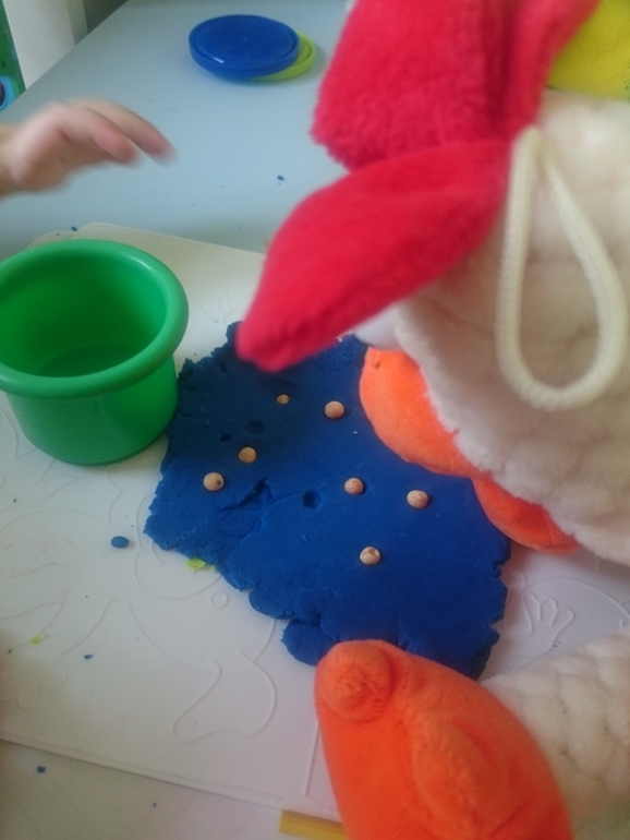 А тут уже перед нами стоит конкретная задача, собрать горох в стаканчик и покормить курочку. Сначала пытается курочку и так покормить, но я говорю, что курочка не может выклевать горошины и ей их нужно собрать. Собирает с удовольствием)))