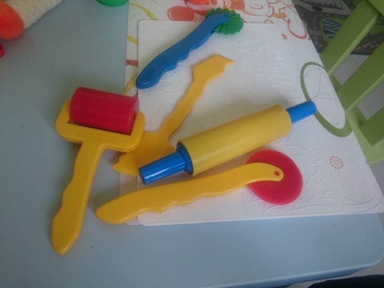 Для раскатывания теста мы используем уже известный вам из моих постов набор фирмы Каляка-маляка. Классный конечно, большой, мы им пользуемся постоянно и с обычным пластилином, и с кинетическим песком, и с плей до. Жалко, что его пока нет в наличие там, где покупали.