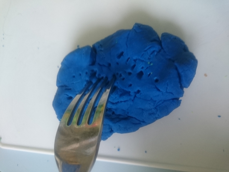Мнем тесто вилочкой или отщипываем кусочки и также, как со шпажками нанизываем на вилочку и кормим кого-то)) в-основном это курочка: