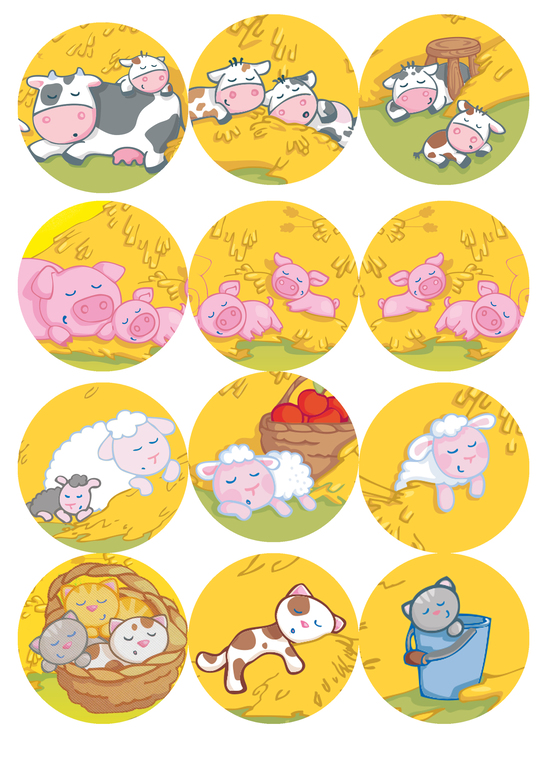 Я сделала в фотошопе аналогичную игру, только без карточек-солнышек, с незначительными изменениями в картинках под вкусы своего ребенка (2 года). Распечатываем на фотобумаге А4, склеиваем круглые зеленые карточки с желтыми. Делаем "сено": вырезать, склеить по 2 детали, сделать надрезы по центру и сложить накрест, как на картинке выше. Раскладываем животных "бодрствующей" стороной вверх. Бросаем кубик (я для таких целей специально купила набор самых дешевых кубиков с алфавитом) - если выпадает луна - переворачиваем одну карточку, желаем животному спокойной ночи. Если на кубике выпадает изображение петушка - петушок (любой из вашей коллекции, например, Лего или Шляйх) вылезает на стог и начинает кукарекать. О, нет! В "ужасе" закрываем рот ладошками и хихикаем. Переворачиваем одну "спящую" карточку обратно - петушок все перепутал и разбудил малыша!