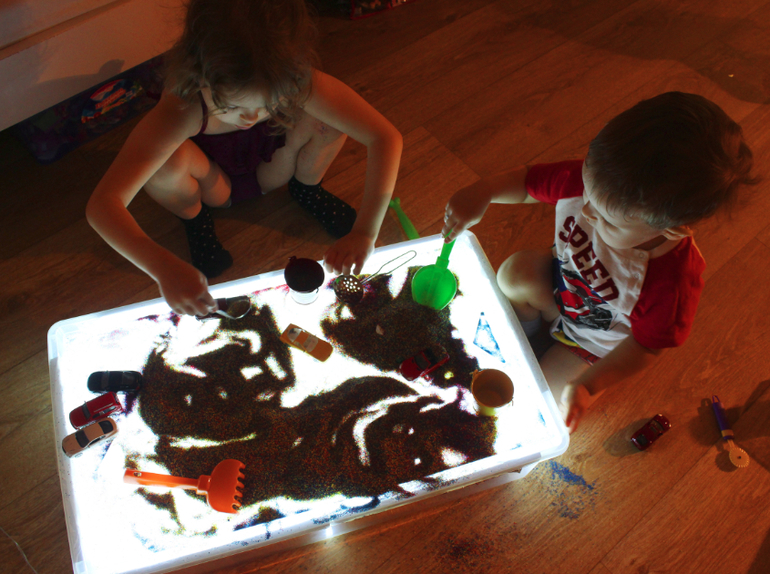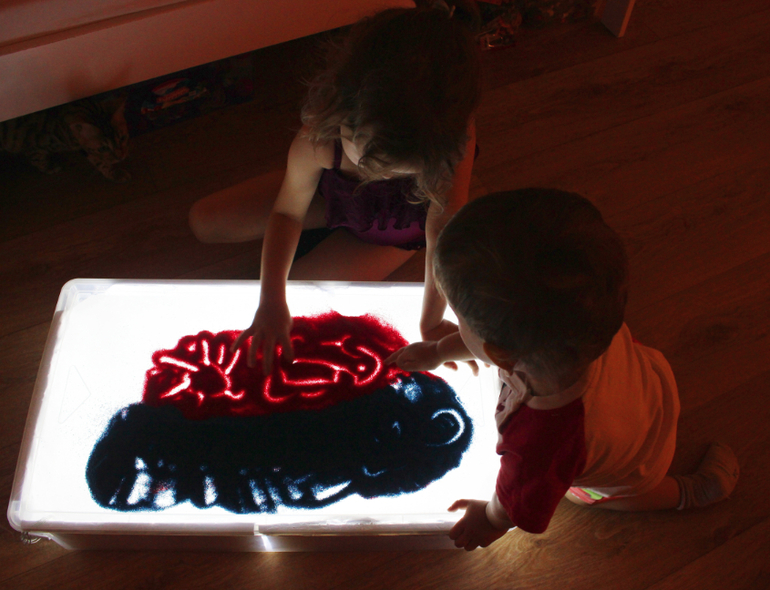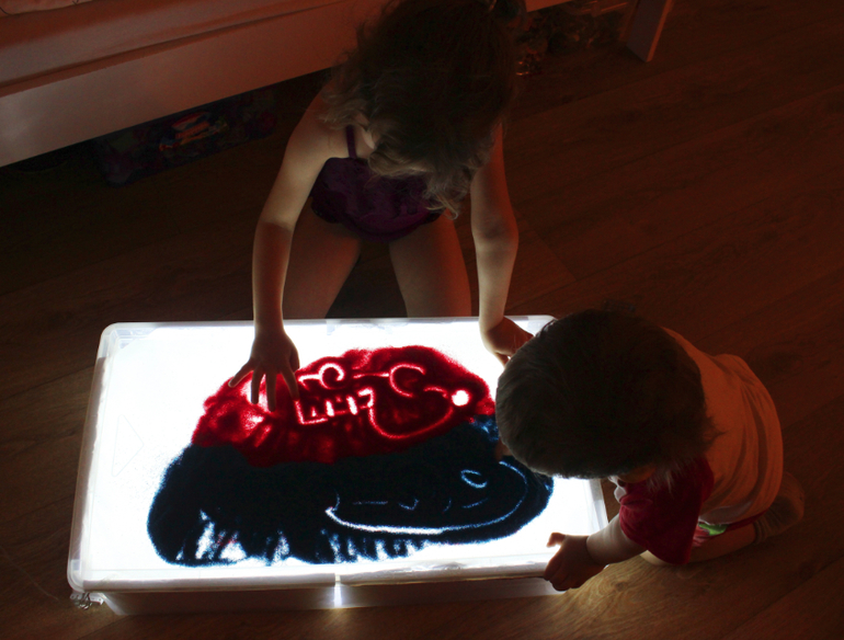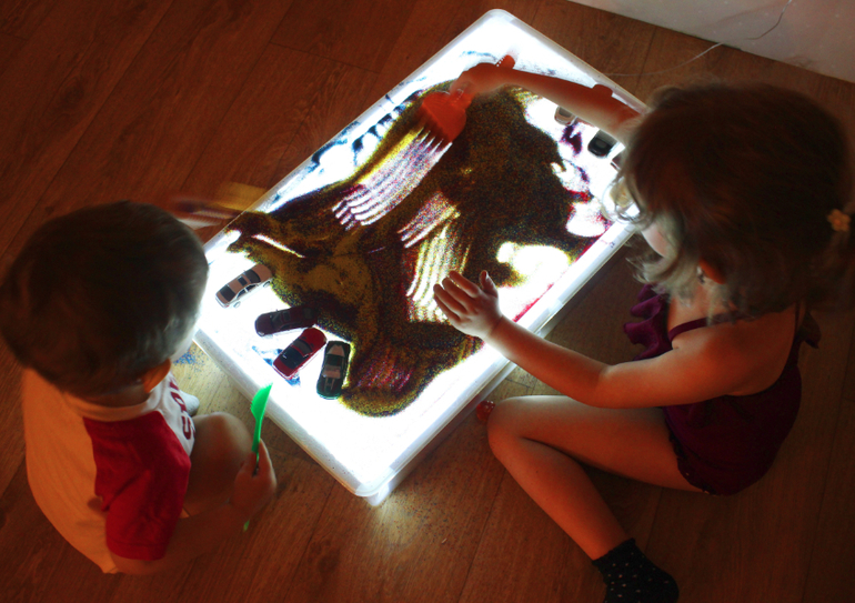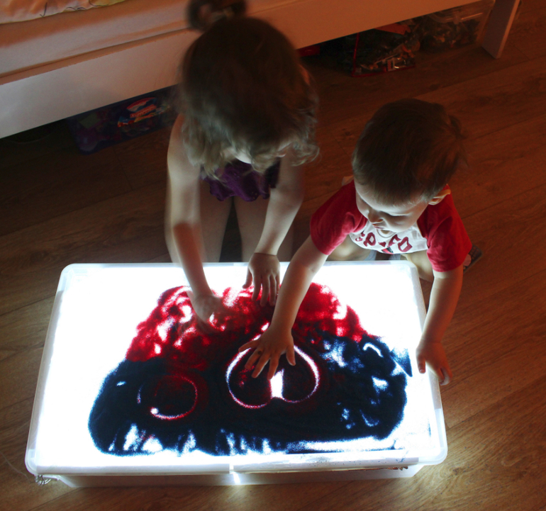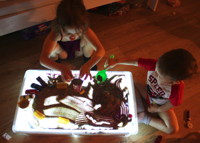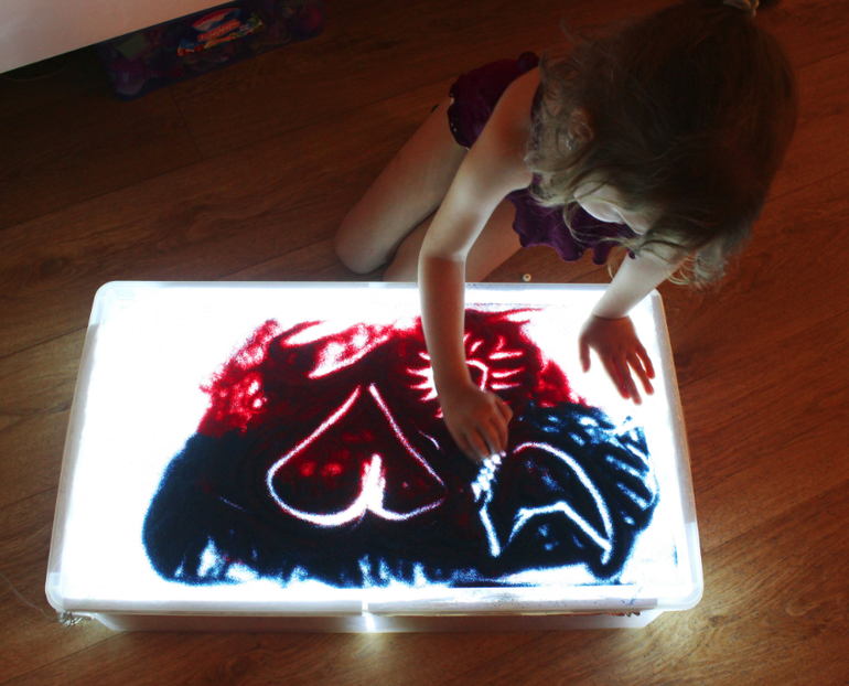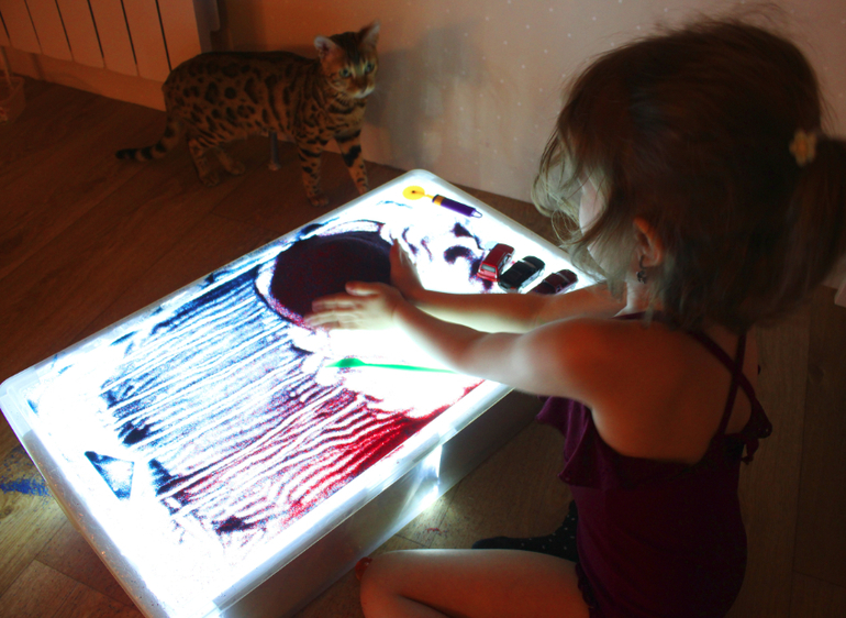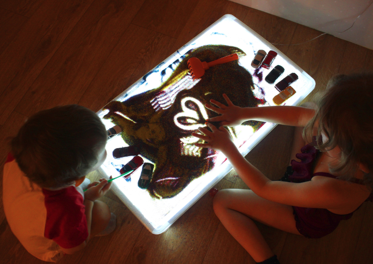 Подключите гирлянду к источнику электричества. Если вы используете разноцветную, тогда поверхность стола будет переливаться всеми цветами радуги. Детский стол для песочной терапии с подсветкой готов!