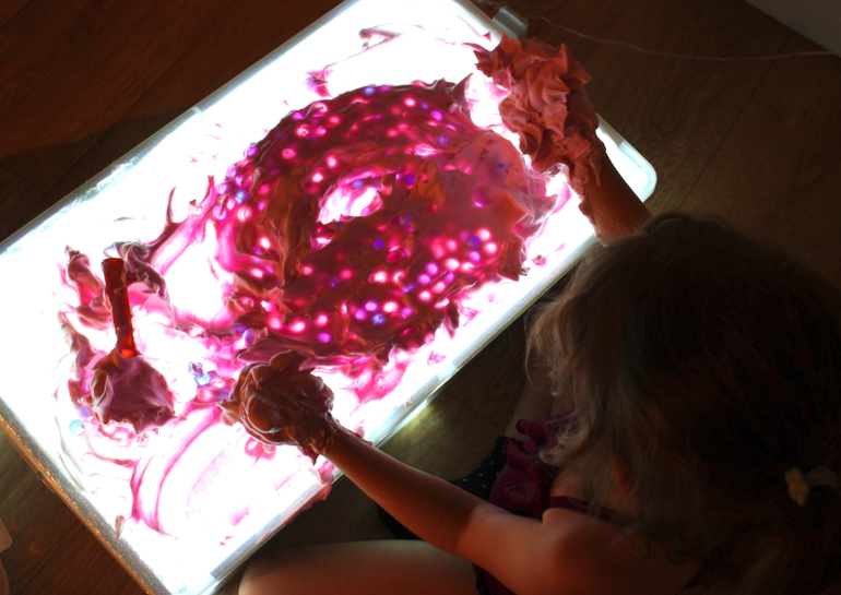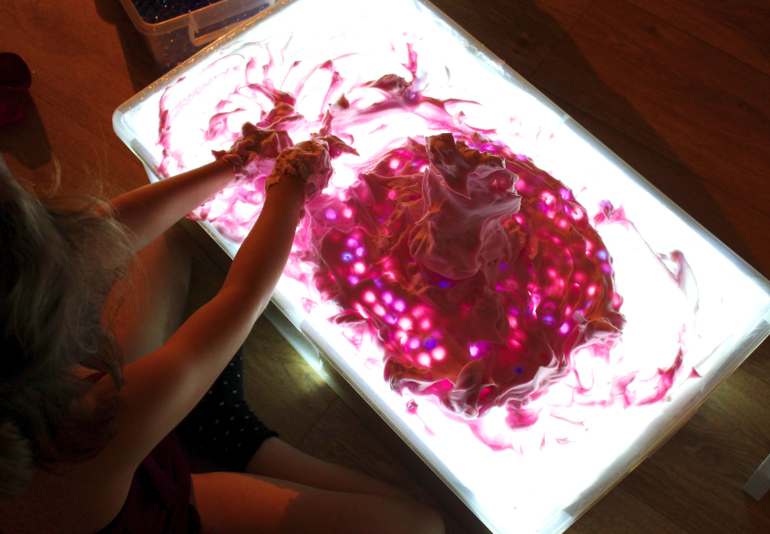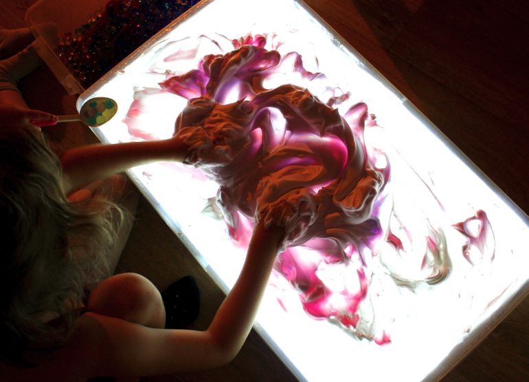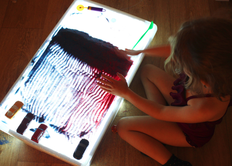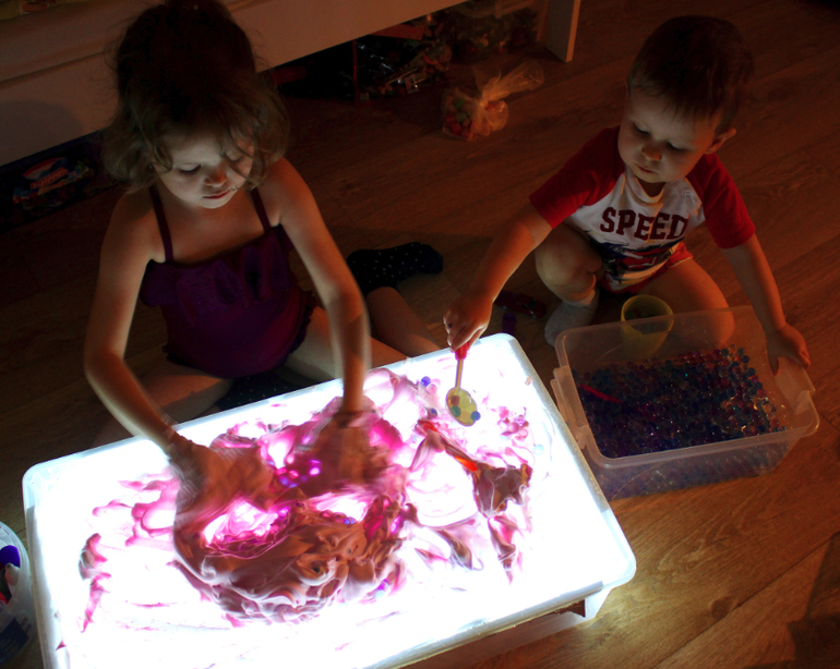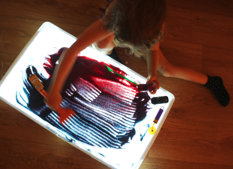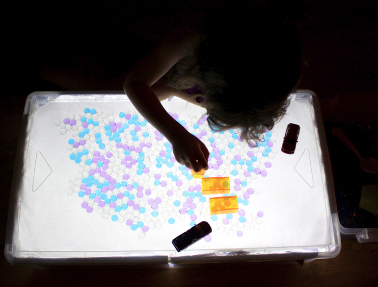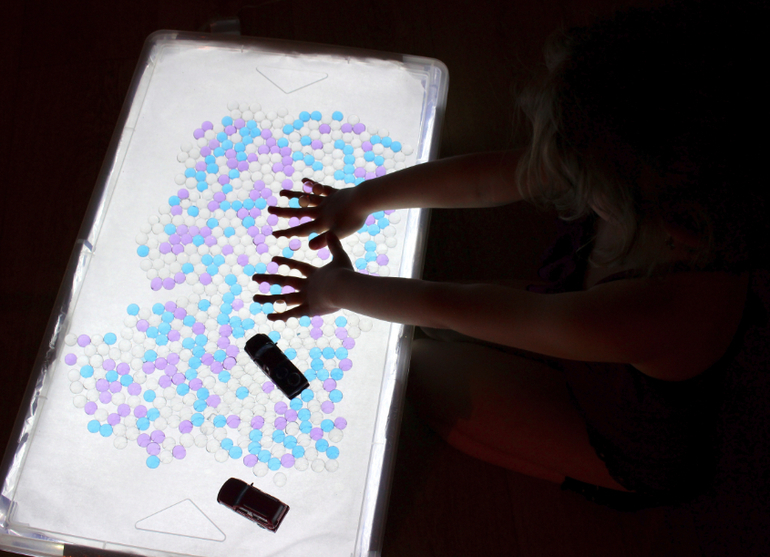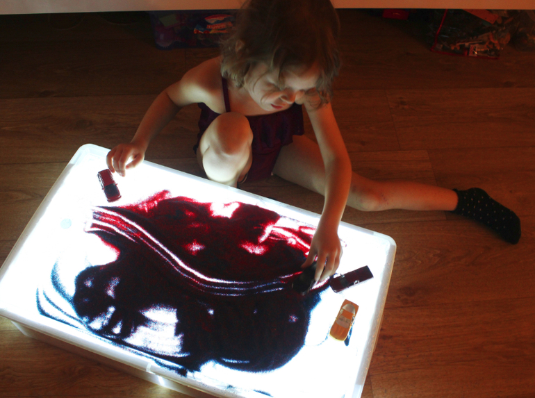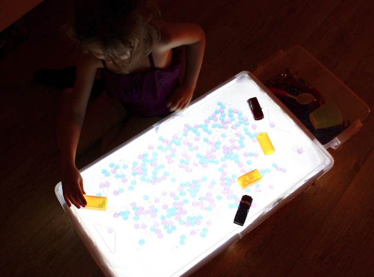 Подключите гирлянду к источнику электричества. Если вы используете разноцветную, тогда поверхность стола будет переливаться всеми цветами радуги. Детский стол для песочной терапии с подсветкой готов!