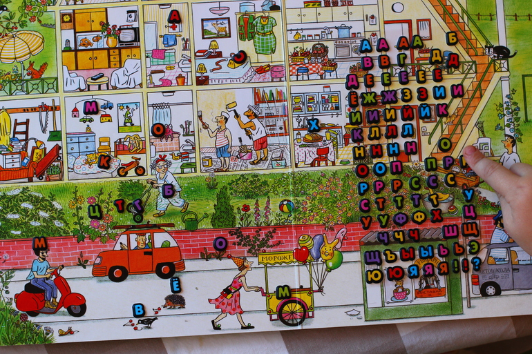 Что я запомнила за эти годы (а значит это, яркое, действительно было интересным и полезным)- наклейки! Есть у нас виммельбухи, которые Кирилл рассматривал, были и наклейки- буквы и появилась простая игра: