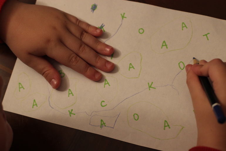 Еще нравится такой альбом с наклейками. Делала я примитивно- на листе А4 наклейки и буквы, Кирюша соединял карандашом картинку и буквы, на которую начинается изображение