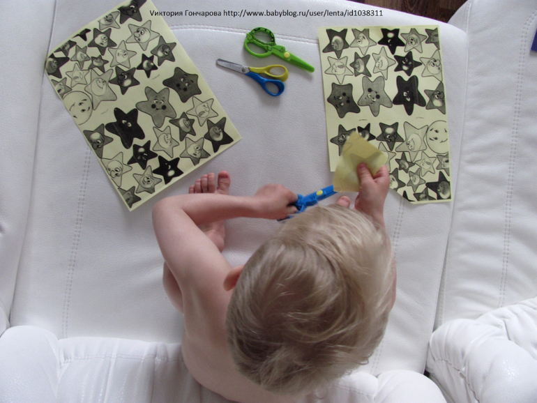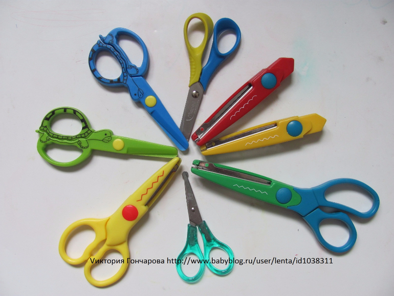 Часто родители боятся острых предметов и лишают детей возможности приобретать важнейшие навыки. Мой ребенок начал знакомство с ножницами в возрасте около 2х лет - конечно под моим присмотром. Первый этап был - правильно и безопасно держать ножницы (осторожно, не махая перед носом, не совершая резких движений). Далее мы начали произвольно резать картон, бумагу. Первые ножницы были очень маленькие с подставкой на присосках в форме зайчика . Ребенку очень нравилась манипуляция вставлять/вытаскивать ножницы из футляра. Ну и конечно,новый процесс вырезания, доставлял большое удовольствие. Практиковались вырезанием каждый день, вернее отрезанием - упаковки от сладостей, от игрушек. Позже одновременно появились пластиковые ножницы и обычные детские фирмы Maped. Пластиковые режут картон хорошо, а вот бумагу немного жуют. Пластиковые покупала в обычном магазине за 19р. Мапедовские ножницы удобны и режут отлично. Потом появились фигурные ножницы - сначала от фирмы "Каляка-Маляка" (очень удобны для детских ручек), затем набор со сменными лезвиями (deVENTE Cosmo 16см Zig Zag) - эти уже подлиннее. Мне показалось что в наборе ножницы туговато меняются, но ребенок справился, и с интересом менял лезвии. С фигурными ножницами познакомились после 3х. Сначала резал обычные фигурные полоски - лапша, сейчас разные рамочки вырезает.