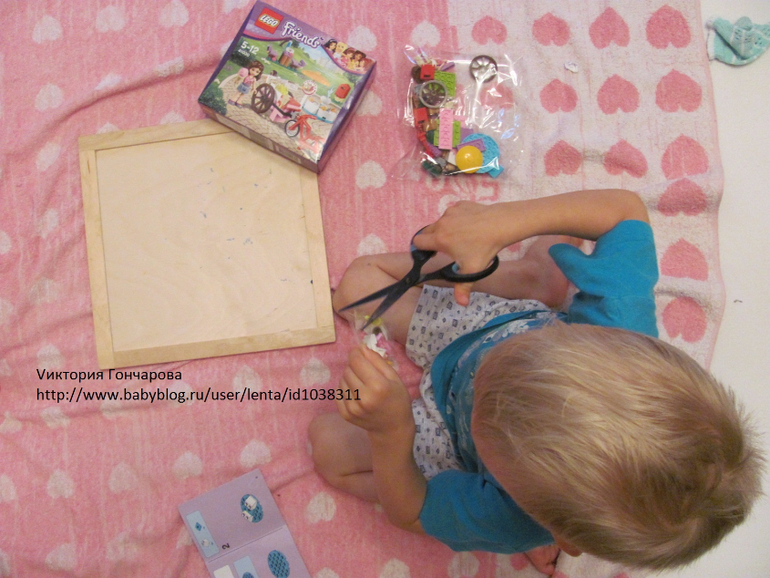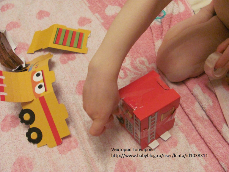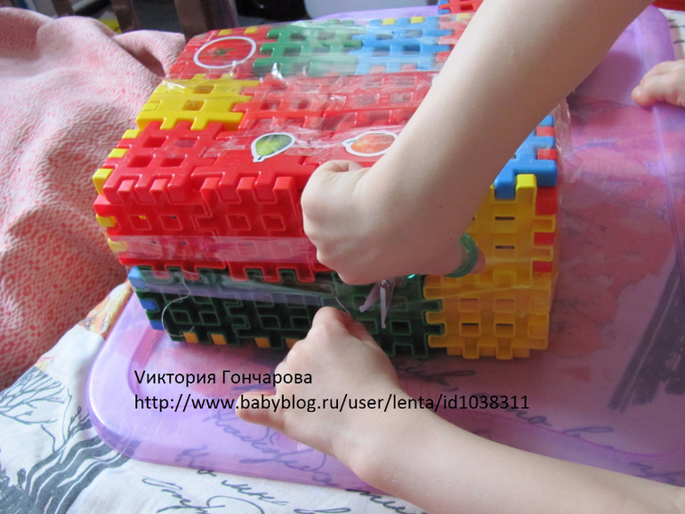 Склеиваем скотчем конструктор -со слов ребенка "Заворачиваем подарок"))