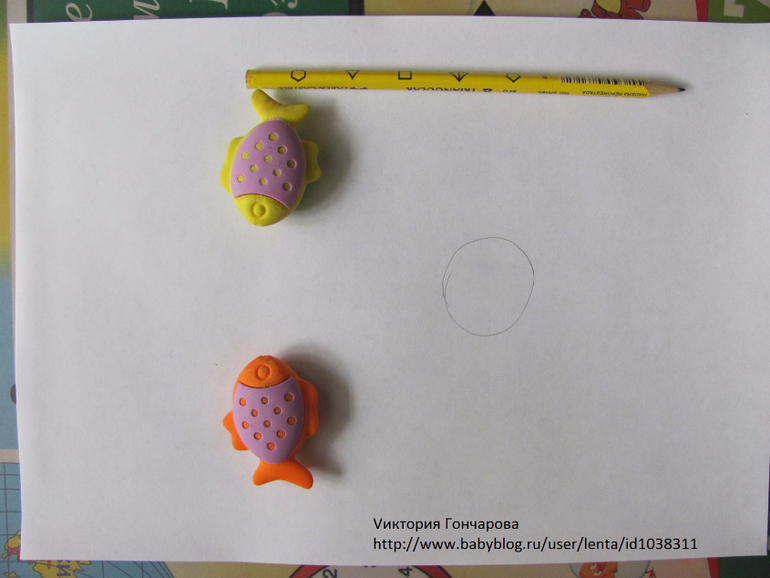 Одно из занятий. Желтая рыбка нарисовала круг, но оранжевая рыбка хочет другую фигуру. Просит ребенка стереть, и рисует квадрат.