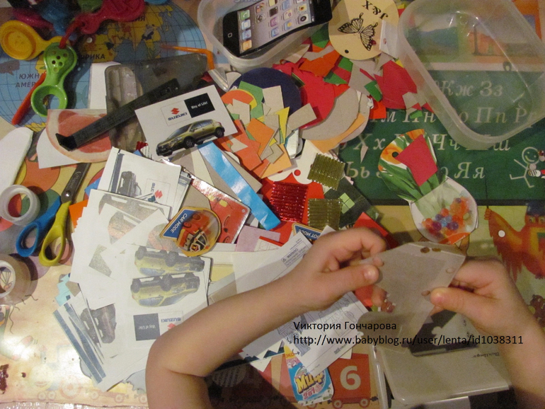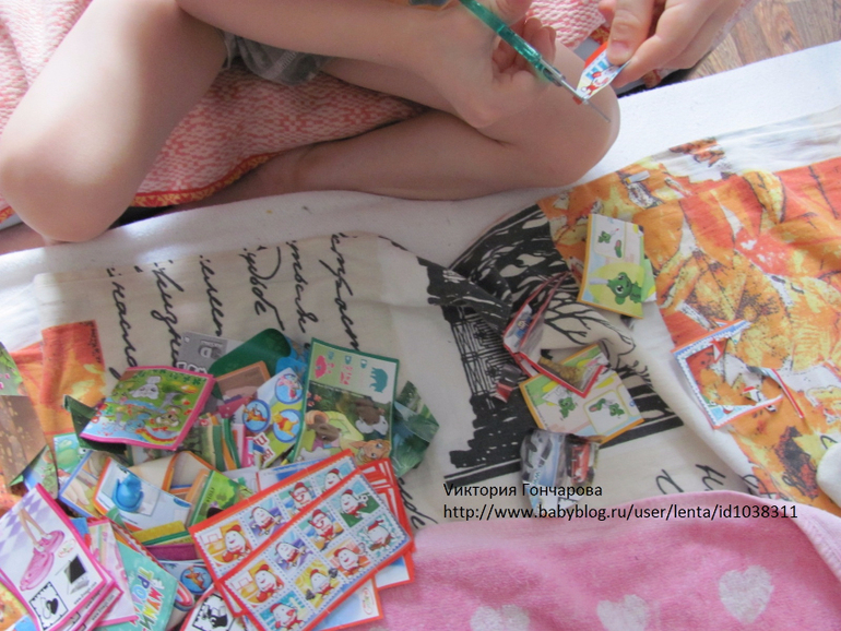 4. Аннотации от киндер-сюрпризов - вырезает, потом клеит на бумагу.