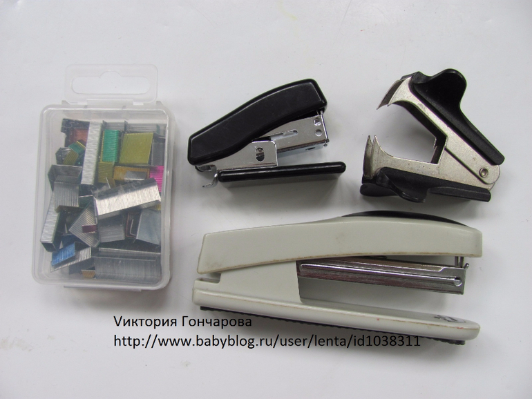 Здесь все очень просто. Два вида : обычный степлер №10 (старенький,с университетских времен) - вначале заинтересовал ребенка, поэтому купила ему небольшой степлер №24. К нему взяла цветные скобы (ну чтоб повеселее было). Сцепляет две одинаковые картинки, или просто несколько листочков из своей коробки.