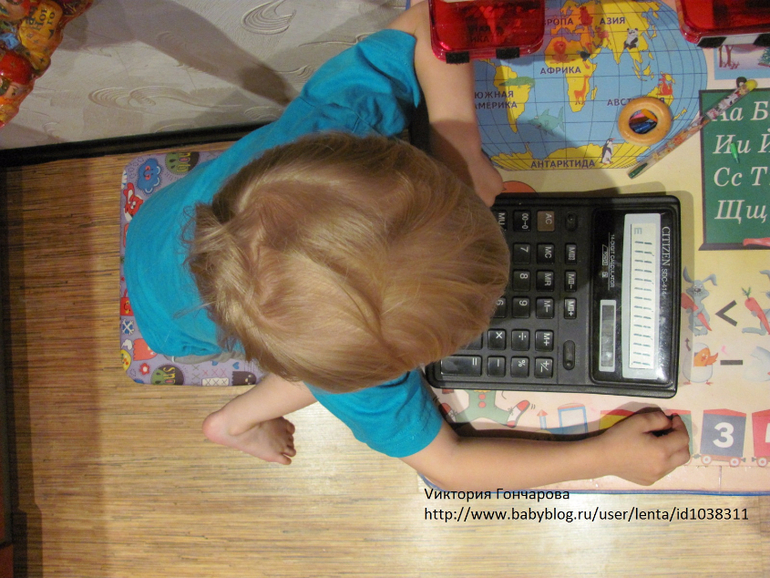 И последний из канцтоваров - это КАЛЬКУЛЯТОР. Предшественник кассового аппарата. Любит работать с ним, а заодно и цифры повторяем.