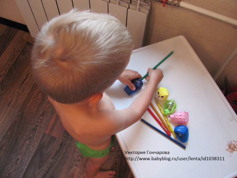 Карандаши он точит самостоятельно ,может по несколько раз точить) При этом вначале показывает мне, говоря "Смотри, карандаш тупой", поточит его - "А сейчас, потрогай мама, он острый, осторожно!"