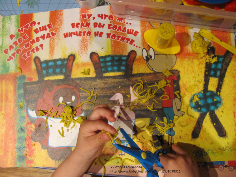 11. Ножницы в пластилиновых играх - режем вермишель, и колбаску.