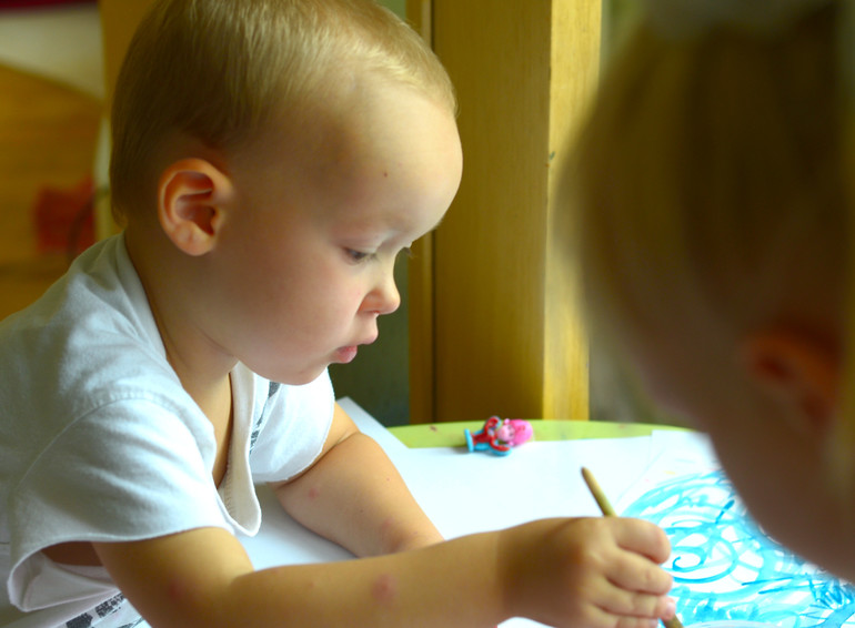 В самом начале нашей "акварельной" деятельности, дети никак не могли запомнить, что кисточку нужно сначала намочить, а затем уже набирать краску. У нас выходило наоборот. Наберут на кисточку краски - и полощут её... Поэтому я заранее намешивала им уже готовой краски в палитру или в баночки от гуаши. Так и им легче, и мне спокойнее.
