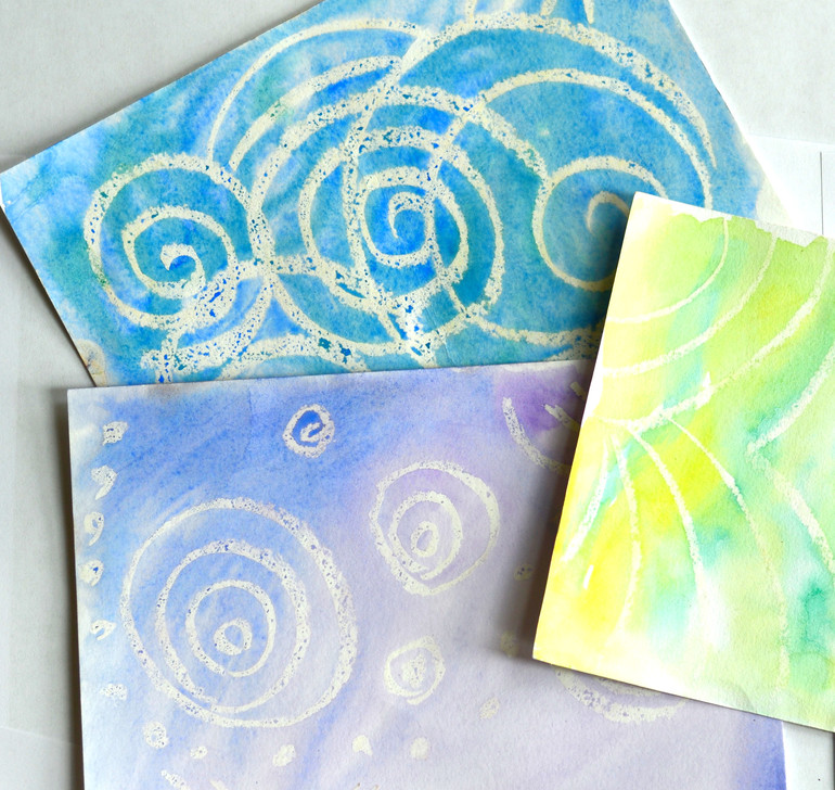 А если перед этим нарисовать на бумаге что то белым восковым мелком - получается вот такое волшебство. Дети в восторге, когда из под их кисточки "проявляются" рисунки или узоры!