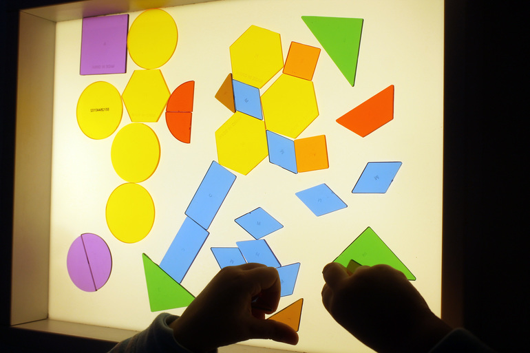Есть немало игр, которые подходят для светового планшета. Так у learning resources (а игрушки этого производителя я очень люблю))) есть игровой набор геометрических форм Shapes Don't Bug Me.