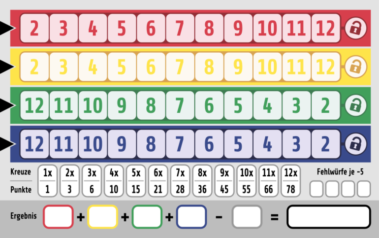 Можно вычеркнуть красную двойку, желтую двойку (желтый 1+ белый 1). И на выбор или зеленый или синий 12 (зеленый 6+белый 6 или синий 6+белый 6) Два раза использовать кубик нельзя.