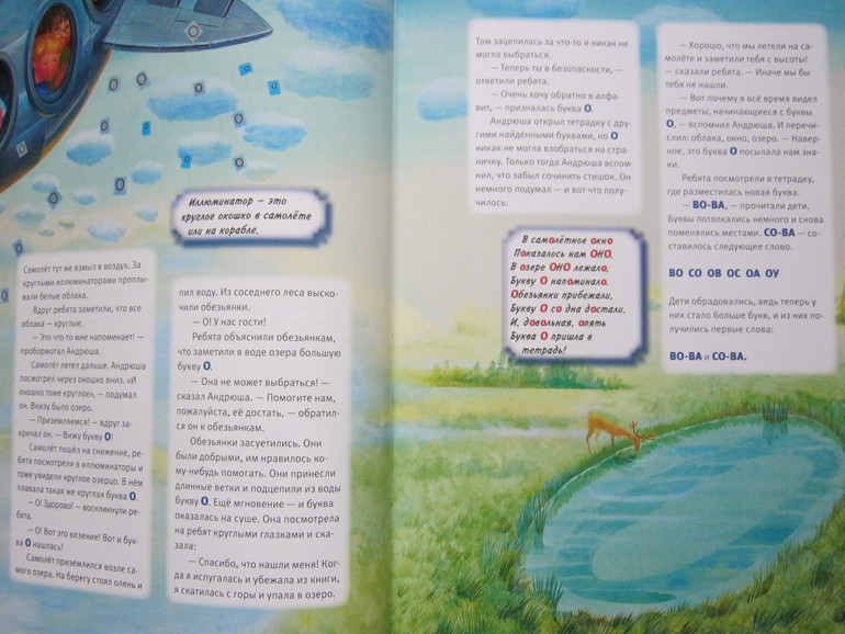 Я долго думала перед покупкой, глядя на развороты. Книга была довольно дорогой и при этом мне не нравилась. Но взяла. Потому что в повествовательной форме она рассказывала о буквах и процессе обучения чтению. А после Али и Кляксича и Азбуки Горбушина нам нужна была как раз такая книга. У нас была одна подобная - Букварёнкина школа Георгия Юдина, но в ней главные герои - опять мишки и мышки.