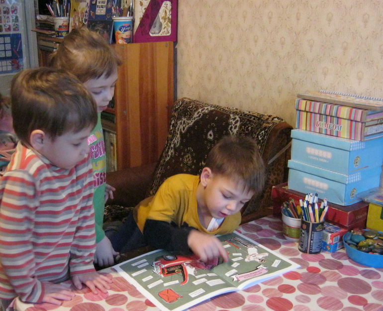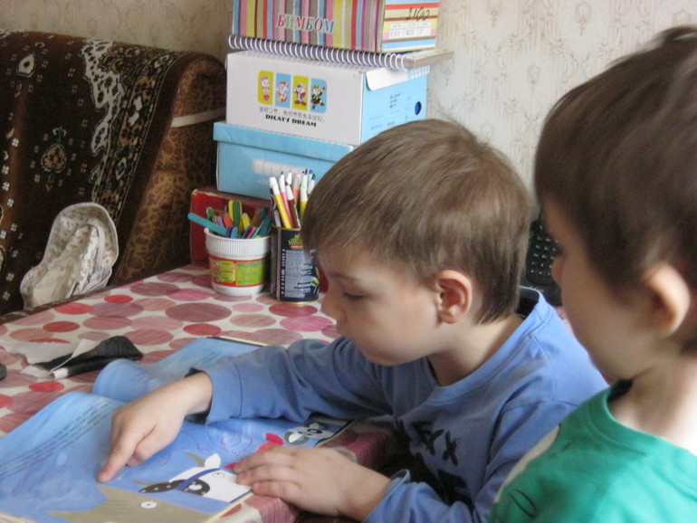 Книга сразу же пошла в ход, мы ее открыли, разглядели прочитали, выполнили все задания, ответили на все вопросы. Мика при этом очень хорошо ориентируется. нисколько не уступая сообразительному Максиму по скорости мышления и внимательности. По праву первооткрывателей они брали ее чаще остальных и подолгу зависали над книгой.