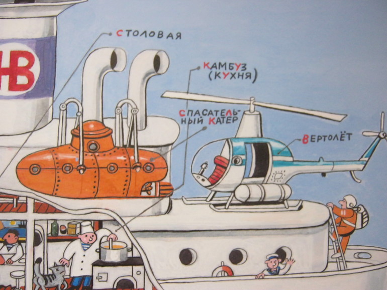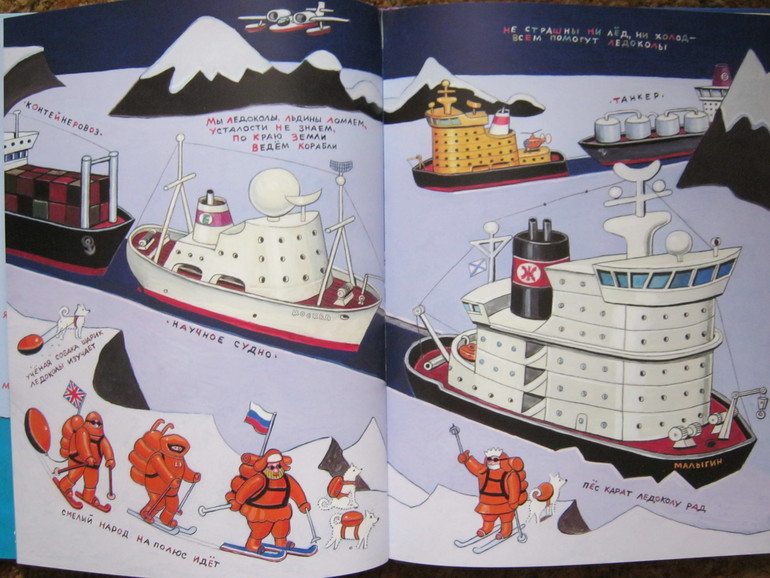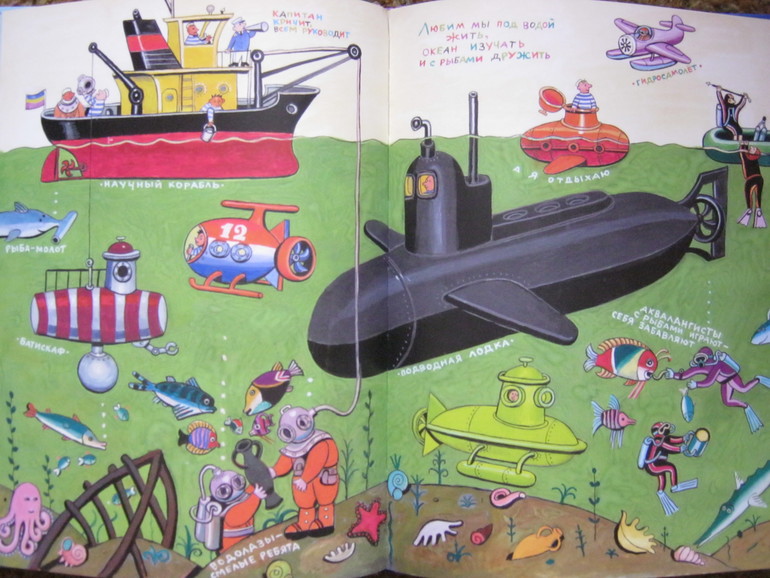 Рифмовочки же довольно корявые - мы такие подписи в сельской школе в своей классной стенгазете к карикатурам сочиняли. Кое-что даже гораздо удачнее получалось. Но листать и смотреть эту книгу даже я люблю, не только дети. Можно найти очень много тем, которые развить потом, подбирая нужные книги. На игры тоже очень вдохновляет. Я ее и купила за бешеные тогда, по моим меркам, деньги, увидев нарисованный батискаф. Мы тогда как раз играли в батискаф набитой камнями бутылкой, поэтому я не могла упустить книгу со столь редко встречающимся в детской литературе чудом техники.