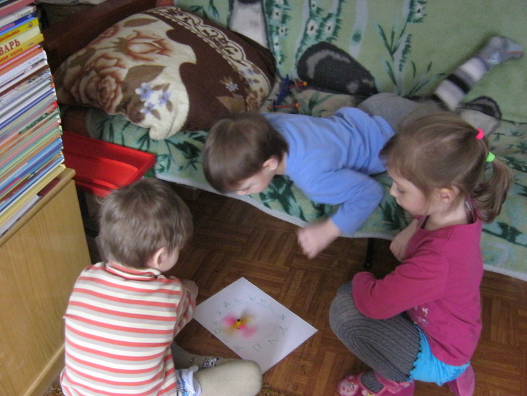 Придуманная когда-то давно, вспомнившаяся сейчас и предложенная детям исключительно по принципу "нате и не орите уже, наконец!", игра с крестиком-вертушкой-указателем, которые они во множестве накручивают из конструктора, неожиданно им понравилась и оказалась очень полезной. Каждый загадывает себе букву, а потом крутит вертушку, соединяет выпавшую букву со своей и говорит слог.