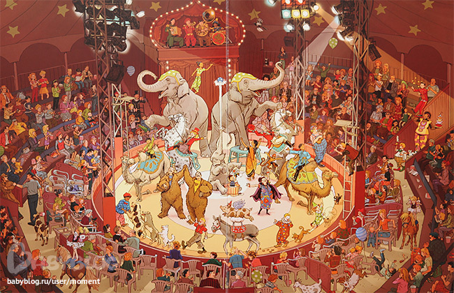 Книга необыкновенная! Я не стала показывать ее Алисе сейчас, а припасла до "когда-нибудь". Думаю, годам к двум мы доберемся до какого-нибудь шапито, и можно будет провести тематическую неделю "Цирк". Без этой книжки точно ничего не получится)