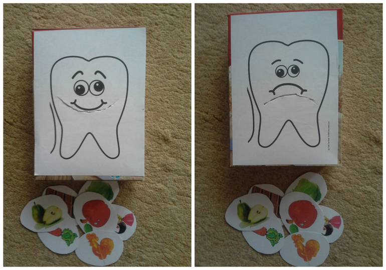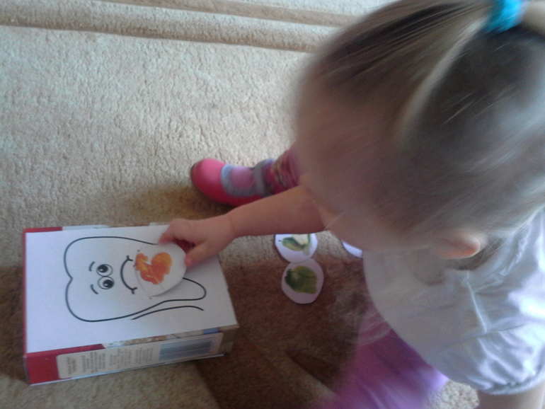 Выяснили, что с помощью зубиков мы пережёвываем пищу,но не всякая пища полезна. Какой-то еде зубки радуются, а от какой-то заболевают и расстраиваются. Выясняли методом сортировки. "Угощали" зубные коробочки полезной и вредной пищей