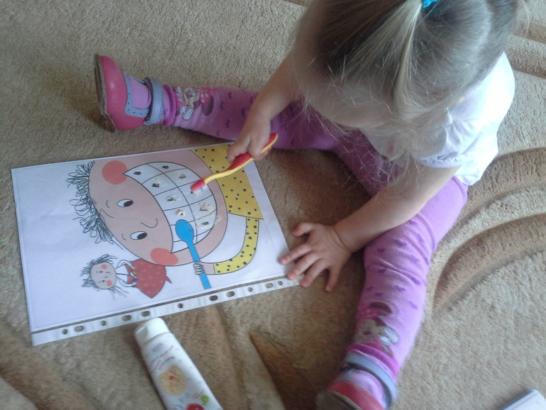 У нас с чисткой зубов всё обстоит неплохо с точки зрения, что Ульяна с утра с удовольствием бежит к раковине, берет щетку, чистит зубки, полоскает ротик...но всё САМА,я не допускаюсь к этой процедуре. Поэтому качество чистки соответствующее. С помощью этой книги и небольших игр хочу научить её, как правильно ухаживать за зубками, и обяъснить, для чего это нужно.