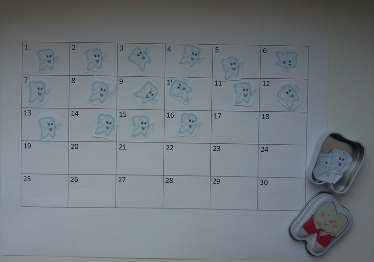 Ну и еще у нас есть календарь чистых зубиков. Каждый день после процедуры Ульяна клеит наклейку-зубик в графу с сегодняшним числом. А наклейки-зубки как раз и хранятся у нас в коробочке. Календарик висит на холодильнике.