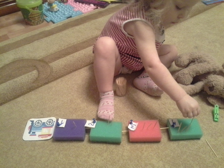 Строили поезд из губок (пытались соблюдать нужную очередность в соответствии с цифрой на губке) и заселяли "пассажирами" (зубочистки) в количестве, указанному на губке.
