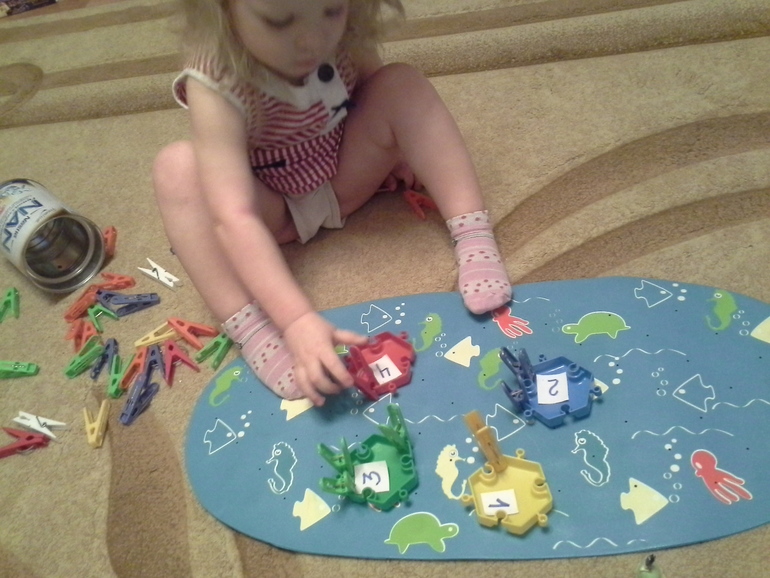 Запускаем в море кораблики с количеством парусов (прищепки), указанным на дне. Плюс здесь еще цветовосприятие