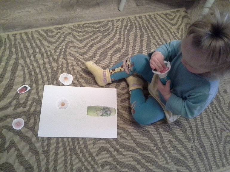 готовимся к танграму. В этот раз делали ромашку из помпончика (сердцевинка) и