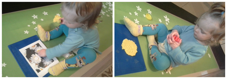 Лепку начали с аналогичной картинки – опять делали сердцевинки ромашке, на это раз пластилином.