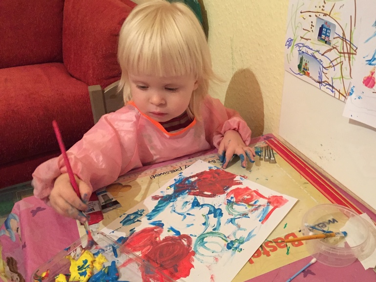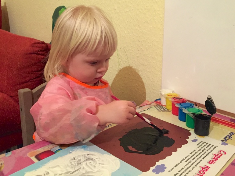 - Творчество: у нас было на этот день запланировано свободное рисование. Попросила Настю нарисовать большие и маленькие круги. Перерасло все в бодиарт, конечно.