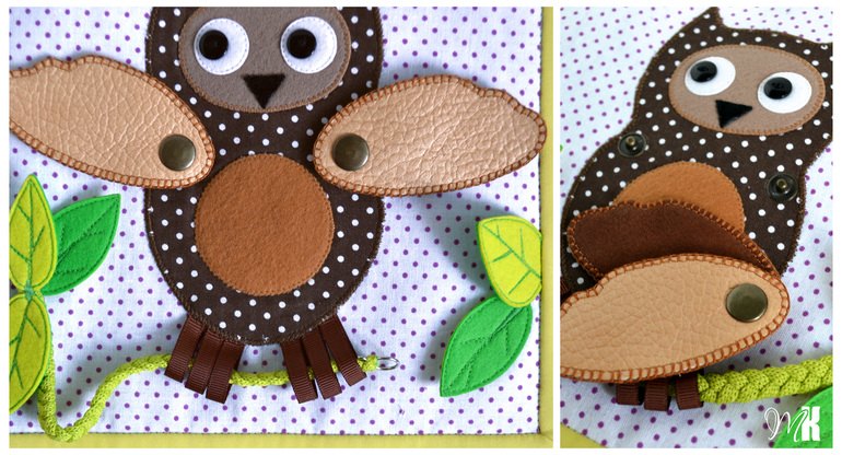 Совушка из хлопка в горошек сидит на ветке, крылья из натуральной кожи на кнопках - крутятся. Играем в «ку-ку», учимся застегивать кнопки.