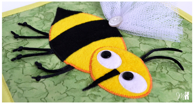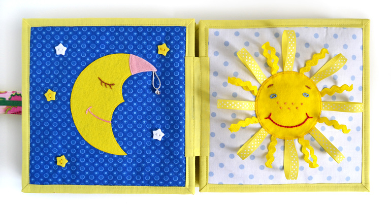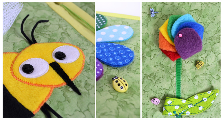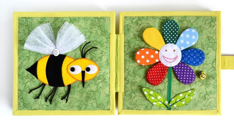 Лепестки отгибаются (одна сторона из хлопка в горошек, другая из мягкого флиса), под фиолетовым сидит пчелка, а под желтым - стрекоза. А за листиком спряталась божья коровка.![]()