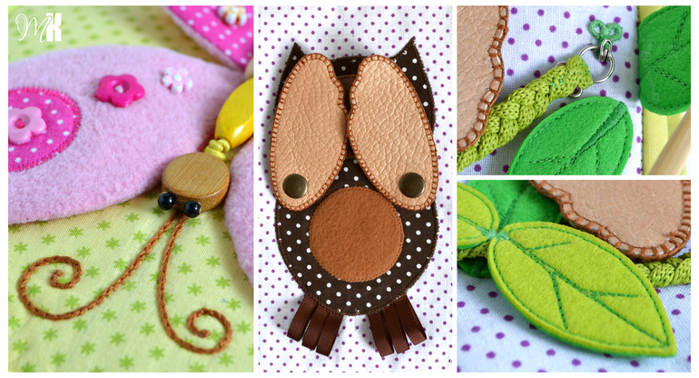 Глазки - пуговки, клюв - кожа, лапки из репсовых лент в виде петелек, в которых проходит шнур (ветка). Отогнув листики - видим крючок, сняв который, можно вытащить шнур. Учимся просовывать шнурок в петельки и вешать на крючок.![]()