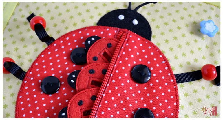 Божья коровка знакомит малыша с молнией, расстегнув которую можно найти трех малышей. Их можно застегивать на пуговки - цветочки.